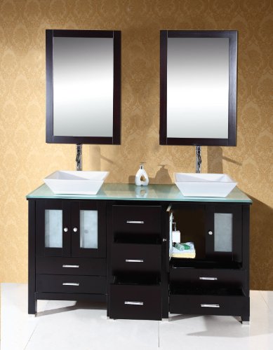 This Very best Selling Virtu USA MD-4305G Bradford 60-Inch Double Sink Bathroom Vanity with Tempered Glass Countertop, White Ceramic Basins, One of several very best on the lookout which can be out one the market place. You can get exclusive discount for Virtu USA MD-4305G Bradford 60-Inch Double Sink Bathroom Vanity with Tempered Glass Countertop, White Ceramic Basins. You can choose to buy a product and Virtu USA MD-4305G Bradford 60-Inch Double Sink Bathroom Vanity with Tempered Glass Countertop, White Ceramic Basins at the Best Selling price On the net with Secure Transaction Here...Description : The Bradford vanity blends European contemporary design with a touch of warmth. Constructed of solid oak with an espresso finish, this vanity provides maximum storage while maintaining a beautiful clean-line appearance. A tempered glass countertop holds two white ceramic vessel basins with modern chrome faucets and pop-up drains. Two matching wall mirrors are included. Handmade by skilled and experienced craftsmen, the fully assembled cabinet has soft-closing hinges and European sliders.