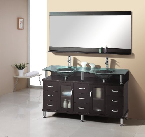 This Most effective Selling Virtu USA MD-61 Vincente Rocco 59-Inch Double Sink Bathroom Vanity Integrated Basins, Faucets, Mirror with Shelf, Espresso Finish, One of many best wanting which can be out a single the market place. You could get unique discount for Virtu USA MD-61 Vincente Rocco 59-Inch Double Sink Bathroom Vanity Integrated Basins, Faucets, Mirror with Shelf, Espresso Finish. You can choose to buy a product and Virtu USA MD-61 Vincente Rocco 59-Inch Double Sink Bathroom Vanity Integrated Basins, Faucets, Mirror with Shelf, Espresso Finish at the Very best Selling price On-line with Secure Transaction Here...Description : The Vincente Rocco vanity establishes a strong, solid foundation for any modern bathroom. A blend of contemporary design elements result in a fresh, cutting edge look for the sleek espresso cabinet and its matching mirror. The heat-tempered safety glass countertop with integrated glass basins create an illusion of space and light. Handmade by skilled craftsmen, the fully assembled solid oak cabinet has two doors with soft-closing hinges and nine European slider drawers.